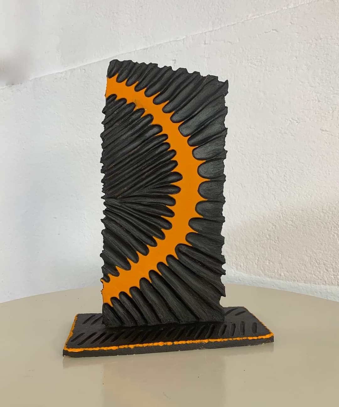 Grès blanc recouvert de barbotine noire et engobe jaune, haut. 31 cm, larg. 22 cm.