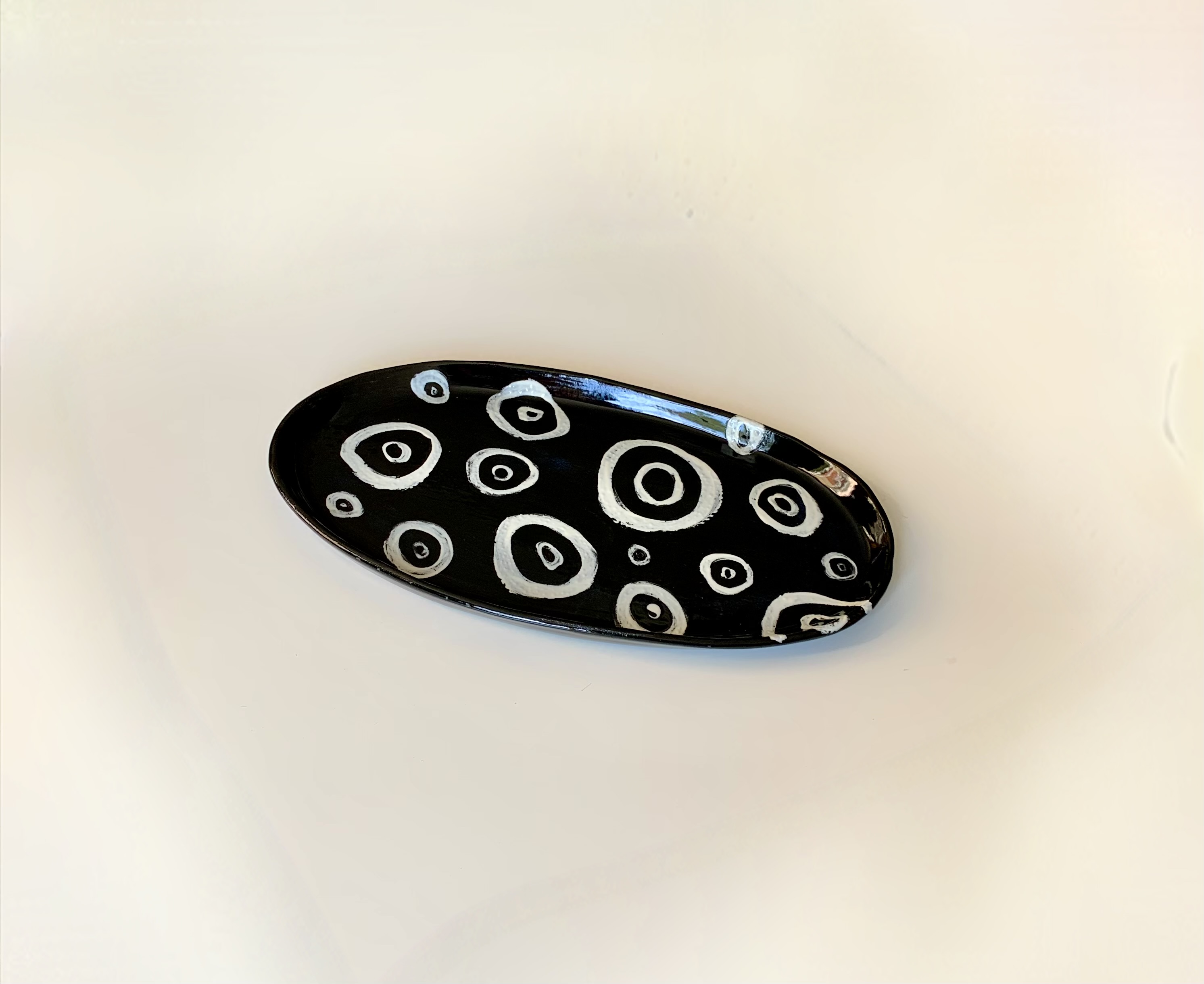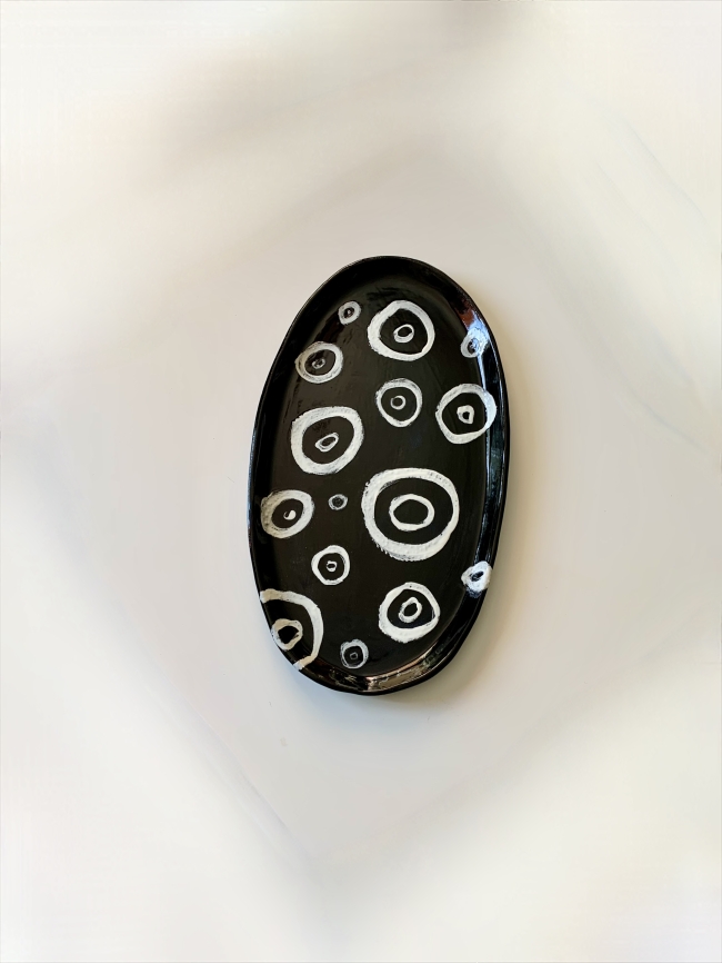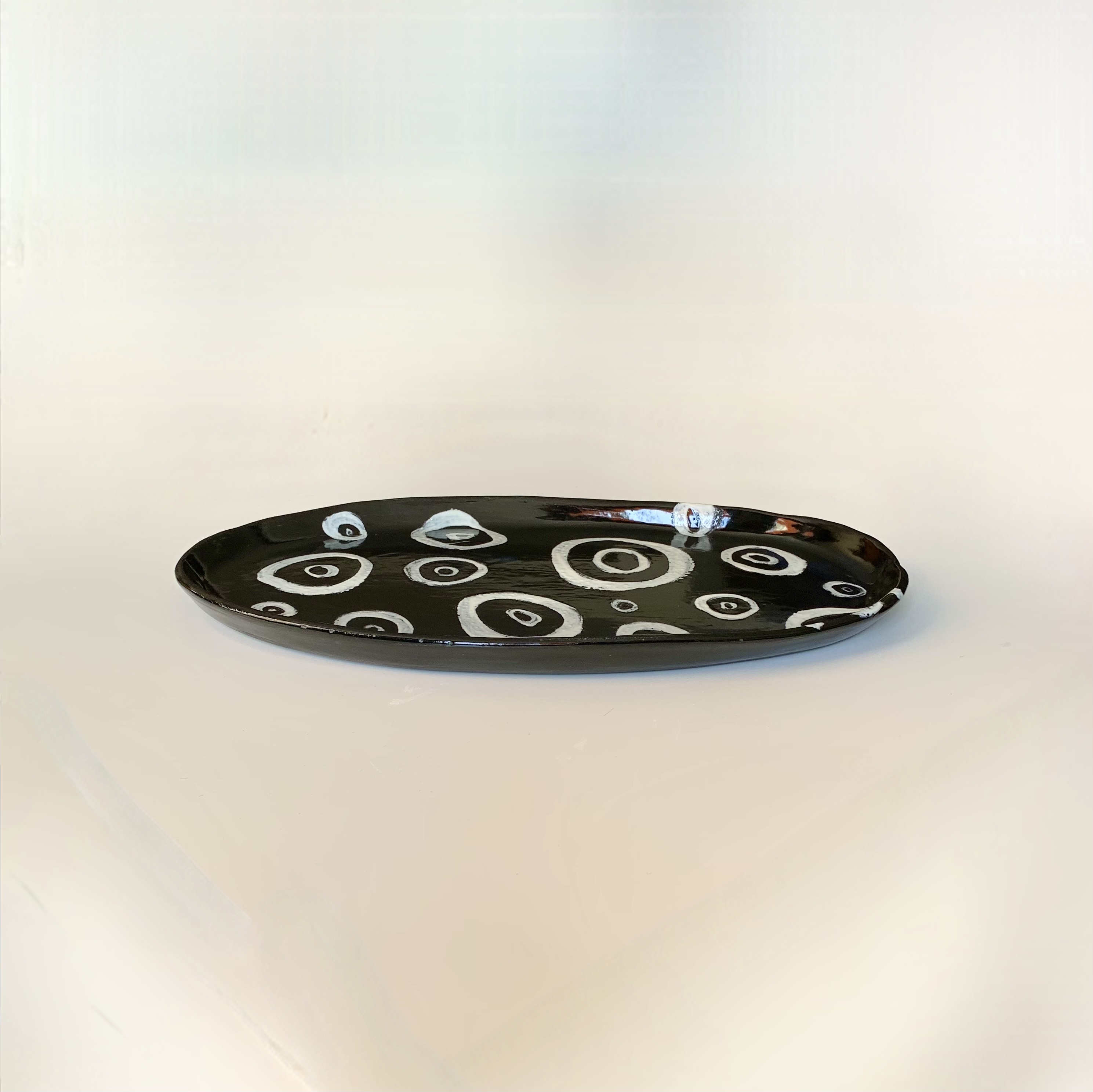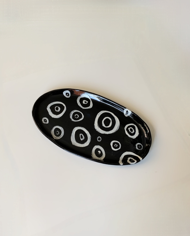 Plat oval en grès blanc, passé sur toute sa surface à l'engobe noir, et engobe blanc pour dessin, émail transparent, larg. 23 cm, long. 40 cm.